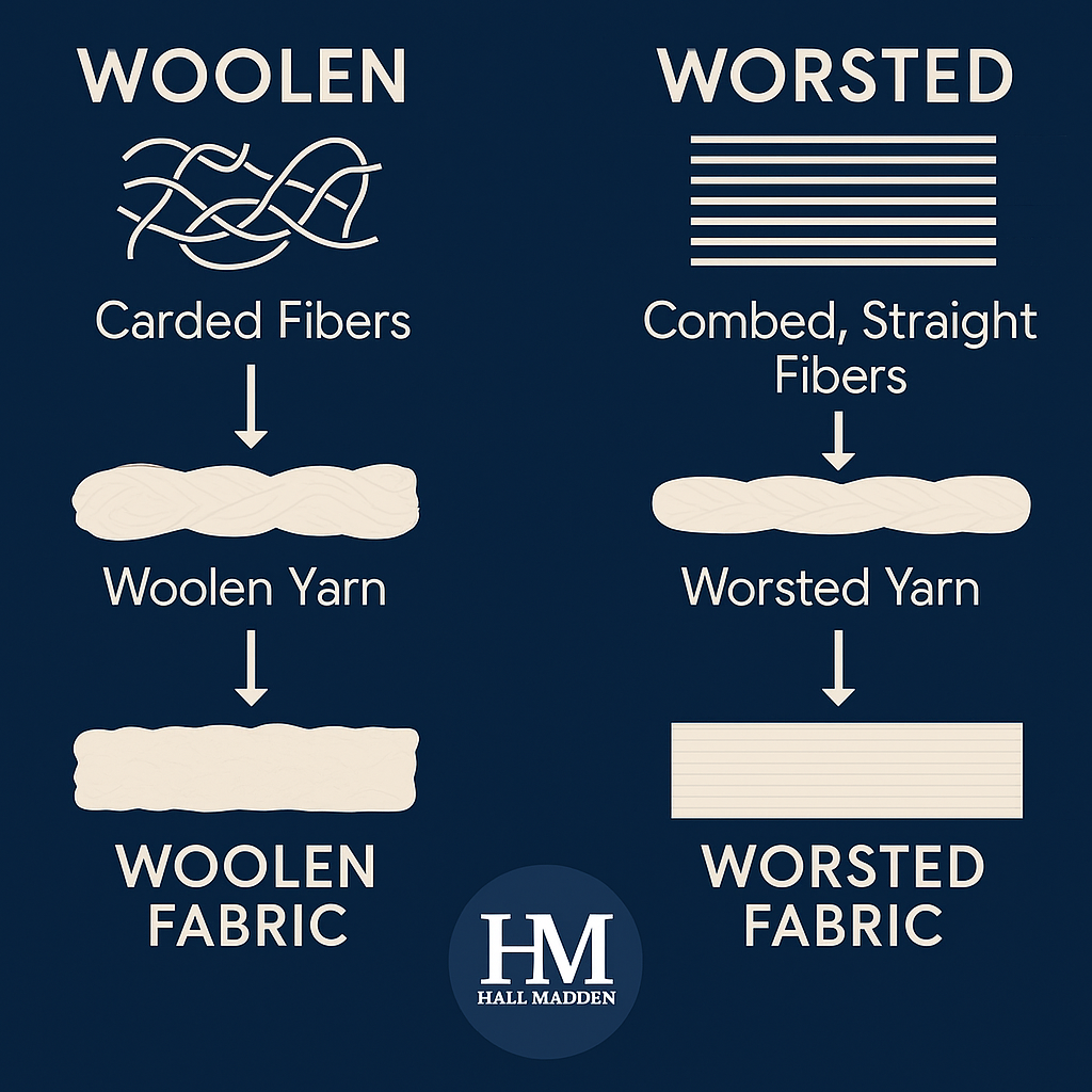 Tweed and flannel are woolens — soft, warm, and textured from carded fibers — while worsted wools are combed smooth, giving a sleek, structured finish for sharper tailoring.